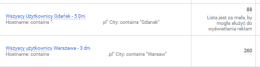 Jeśli korzystasz z remarketingu to wolumen danych tzn. lista odbiorców musi wynosić co najmniej 100, aby danej grupie można było wyświetlić reklamy. Z tego powodu kierowanie na mniejsze miasta często będzie niemożliwe, natomiast kierowanie na Warszawę czy Kraków może być jak najbardziej realne.