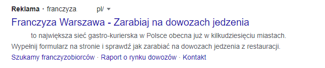 Pomysł na personalizację: spróbujmy podzielić konto Google na kampanie kierowane do osób w dużych miastach, małych miastach i na wsiach. W reklamach podkreślmy, że oferujemy franczyzę właśnie w lokalizacji, w której znajduje się użytkownik, a dodatkowo zwróćmy uwagę na te atuty, które mogą okazać się dla niego kluczowe, np. wsparcie techniczne dla franczyzobiorców w małych miastach i na wsiach.