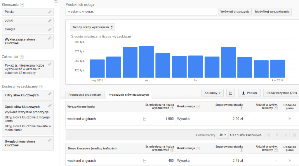 Na bazie Planera słów kluczowych, możesz dowiedzieć się na przykład, że fraza: weekend w górach na przestrzeni miesiąca wyszukiwana była w Polsce przez 1900 osób, a koszt kliknięcia reklamy przy użyciu tego słowa wyniósł średnio 2,90 zł. Z danych można również odczytać, że wspomniana fraza miała wysoką konkurencję, co może znacząco uszczuplić nasz budżet. Poniżej zobaczysz pełną listę słów kluczowych zbliżonych tematycznie do Twojej frazy, które mogą okazać się tańsze, mające mniejszą konkurencję, a będące równie skuteczne.