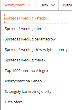 2. Asortyment – umożliwia wygenerowanie raportów sprzedażowych Allegro na własnym koncie oraz całym Allegro (tylko w przypadku abonamentu profesjonalnego i eksperckiego) według: