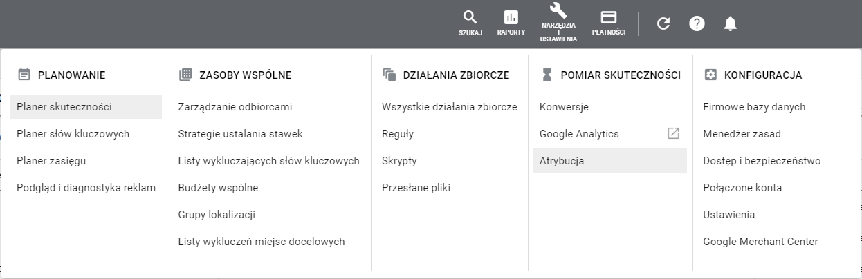 W panelu Google Ads raport atrybucji znajdziemy w: Narzędzia i Ustawienia, następnie dział Pomiar skuteczności i tam jest karta Atrybucja. O tutaj: