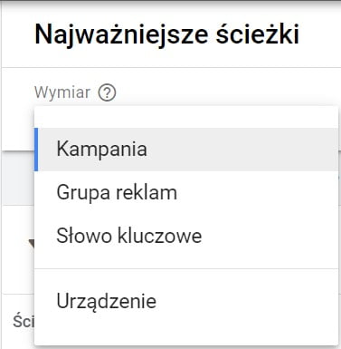 W tym raporcie mamy dostępne dokładnie te same elementy sterujące co w zakładce Najważniejsze ścieżki: zakres dat, działanie powodujące konwersję, okres ważności oraz wymiar (kampania/ grupa reklam/ słowo kluczowe/ urządzenie).
