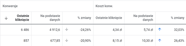 Powinniśmy tutaj zauważyć też takie zjawisko, że jak w części kampanii mamy spadki w ilości i wartości konwersji to w innych są wzrosty. To pokazuje nam, jak zmienią się dane w podstawowych raportach Google Ads jeżeli zmienimy model atrybucji w ustawieniach konwersji. Możliwe, że już to robiliście i po takiej zmianie zauważyliście spadki w konwersjach. Jest to złudzenie, szczególnie jeżeli przejście dotyczyło rezygnacji z modelu ostatniego kliknięcia. Po prostu udział w konwersji, który mieliśmy przypisany do jednej kampanii został rozłożony w czasie i między różne kampanie.