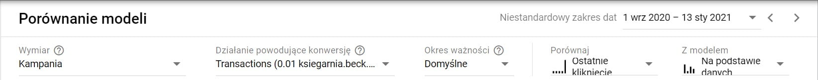 Jak się pewnie domyślacie ten raport służy do porównywania wyników przez pryzmat różnych modeli atrybucji. Podobny raport znajdziecie w Google Analytics. Różnią się one tym, że w Google Ads możemy wybrać dwa modele atrybucji do porównania, a w Google Analytics trzy.