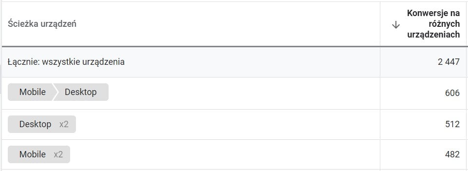 Chodzi tutaj o kolejne wizyty klienta na stronie z reklam Google Ads. Znajdują się tutaj informacje o tym z jakich kampanii/ grup reklam/ słów kluczowych/ urządzeń pochodziły kliknięcia bądź wyświetlenia reklam zanim klient dokonał transakcji. Możemy prześledzić, które kampanie rozpoczynają ścieżkę, a które ją kończą. Tak samo można analizować grupy reklam, frazy i urządzenia. Łącząc te informacje z lejkiem sprzedażowym możemy dostosować komunikat reklam w zależności od tego, na jakim etapie zakupów są nasi potencjalni klienci. Ta informacja przyda się nam także do poprawnej oceny kosztów konwersji, wartości ROAS czy ERS. Reklamy rozpoczynające ścieżkę zakupową wymagają większych nakładów, mają słabsze efekty niż te, które są na poziomie „Działanie” w lejku sprzedażowym. Analizując ścieżki urządzeń możemy się przekonać czy rzeczywiście nasi klienci korzystają z wielu urządzeń oraz które urządzenia są wykorzystywane przy poszukiwaniach produktów, a na których klienci kupują. Poniżej przykład, na którym widzimy, że wśród tych klientów występują 3 podstawowe ścieżki urządzeń: