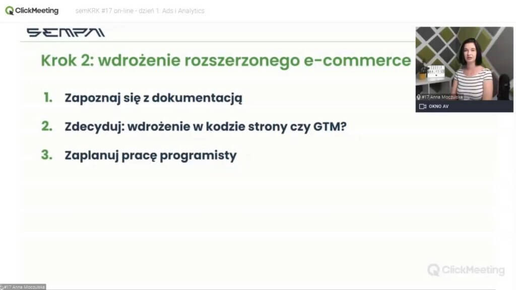 Anna Moczulska – Web analyst w Sempai – swoim występem podczas semKRK#17 on-line wygrała pierwszy dzień naszej konferencji. Wcześniej, kampania, którą współrealizowała dla innogy.pl, zajęła 3. miejsce w konkursie semKRK 2019. Ania regularnie prowadzi webinary nt. analityki i CRO dla wszystkich zainteresowanych. Cieszymy się, że prelegentka znalazła chwilę, aby wystąpić również u nas!