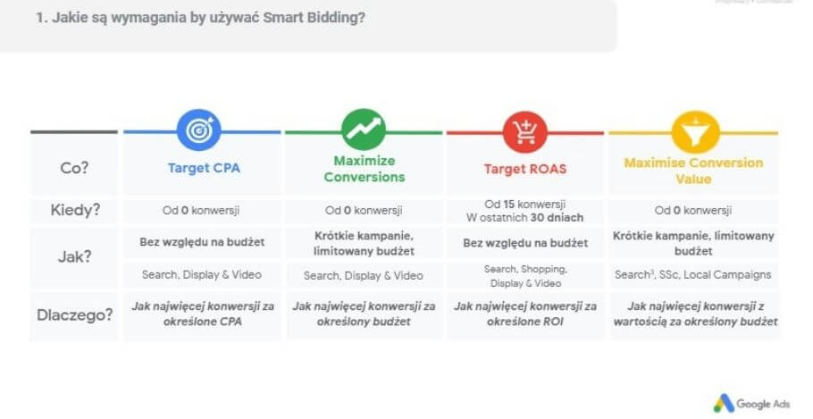 Sposób w jaki prowadzone są aukcje się nie zmienia. Udział w aukcjach podczas używania Smart Biddingu jest analizowany na podstawie milionów sygnałów, które w czasie rzeczywistym przewidują wynik – czy będzie kliknięcie, czy będzie konwersja i czy aukcja wpłynie pozytywnie, czy negatywnie na założenia kampanii (przykładowo, czy cel zostanie osiągnięty). Smart Bidding tylko pomaga osiągać cele, w coraz to bardziej skomplikowanym środowisku.