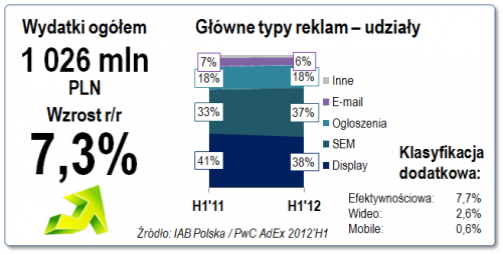Według badań IAB AdEx wartość polskiego rynku reklamy online w pierwszym półroczu 2012 wyniosła 1,03 miliarda złotych. Wiele wskazuje na to, że rok 2012 będzie rekordowy dla rynku reklamy online w Polsce mimo, że odnotowane zostały spadki na reklamę w mediach. Potwierdziły się prognozy dotyczące wzrostu udziału SEM w wydatkach na reklamę (wzrostu udziału z 33% do 37%). Widoczny jest także wzrost budżetów reklamowych na reklamę mobilną oraz reklamy wideo online. Więcej informacji znajdziemy w raporcie, który można pobrać ze strony IAB.
