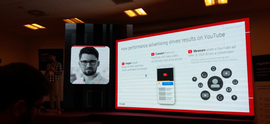 Kamil Glenszczyk podzielił się z publiczności nowościami, które będą dostępne w kampaniach reklamowych na YouTube m.in. przyciski z call to action (TrueView for Action) oraz rozszerzenie lokalizacji w kampania YouTube (Location Extensions for TrueView Ads). Przedstawił również za pomocą jakich narzędzi mierzyć skuteczność kampanii na YT.