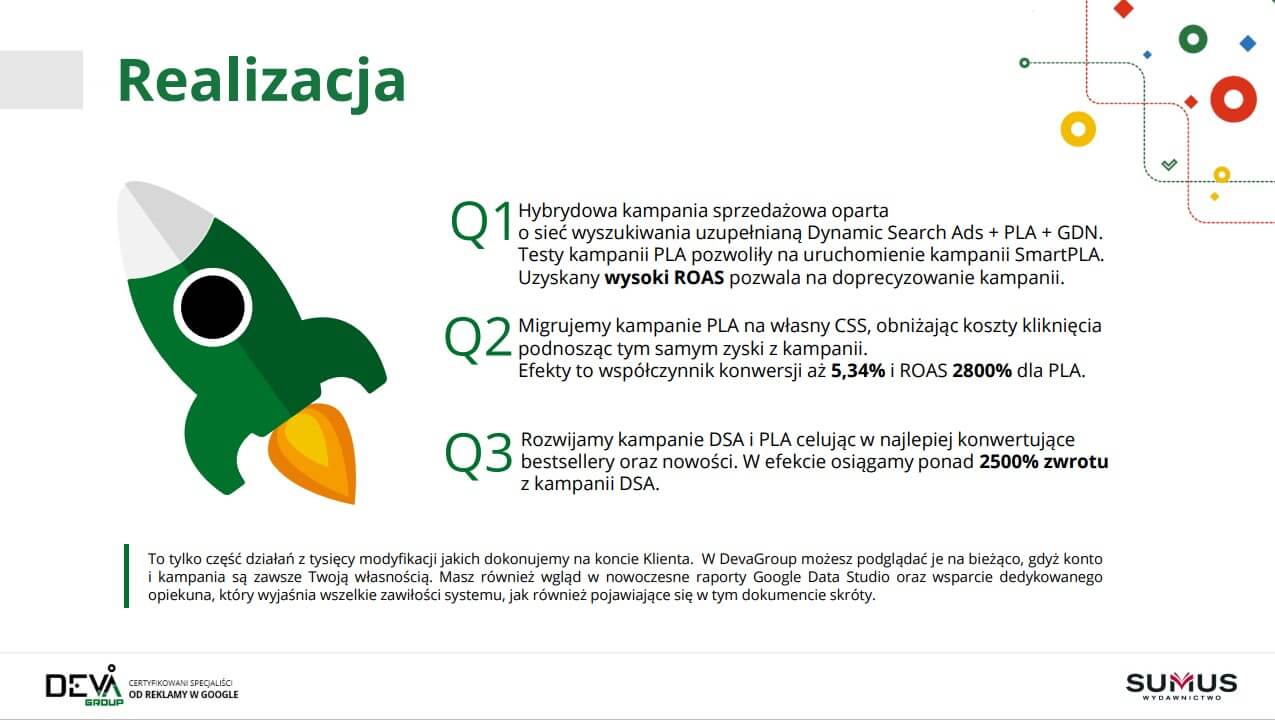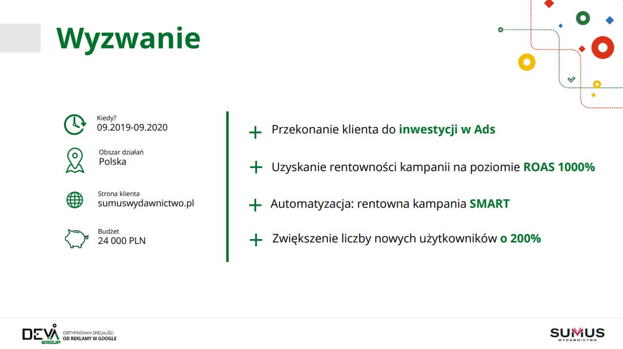 Współpracę z zakresu kampanii Google Ads rozpoczęliśmy z Wydawnictwem SUMUS we wrześniu 2019 roku. Wcześniej, od kwietnia 2019 roku, klient prowadził już działania marketingowe z DevaGroup – wspólnie z naszym działem SEO została ustalona oraz konsekwentnie realizowana strategia pozycjonowania. Kolejny krok, na jaki zdecydował się właściciel Wydawnictwa Pan Wojciech, to rozpoczęcie działań kampanii Google Ads, które zostały dołączone do strategii promocji sklepu.
