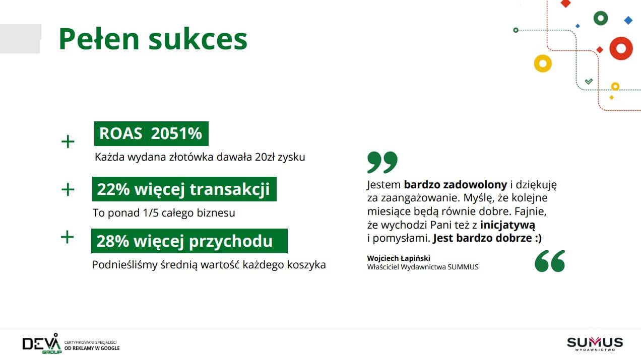 Po roku współpracy (od września 2019 do września 2020) udało się nam wspólnie z wydawnictwem SUMUS wypracować ROAS na poziomie 2051%. Każda wydana złotówka na kampanię dawała nam 20 zł zysku. Wygenerowaliśmy o 22% więcej transakcji uruchamiając kampanię Google Ads – co dało ponad ⅕ przychodu całego biznesu. W efekcie odnotowaliśmy wzrosły zarówno w przychodach, jak i w transakcjach. Porównując dane google / cpc vs wszyscy użytkownicy osiągnęliśmy średni wzrost o 21,17% transakcji Google Ads oraz średni wzrost przychodów o 26,78%.