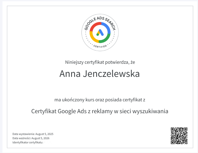 Dla klienta współpraca z certyfikowanym specjalistą Google Ads oznacza większe bezpieczeństwo inwestycji w reklamę online i mniejsze ryzyko kosztownych błędów na etapie planowania oraz optymalizacji kampanii. Certyfikat potwierdza, że osoba prowadząca działania reklamowe zna aktualne standardy platformy Google Ads, rozumie mechanizmy aukcji, struktury kampanii, strategii ustalania stawek oraz zasady optymalizacji pod cele biznesowe. W praktyce przekłada się to na lepsze wykorzystanie budżetu, trafniejsze decyzje optymalizacyjne i większą przewidywalność wyników. Klient zyskuje także większą transparentność współpracy, rzetelne raportowanie oraz pewność, że kampanie są prowadzone zgodnie z najlepszymi praktykami i aktualnymi wytycznymi Google.
