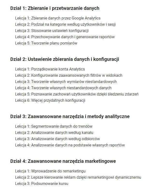 W ramach każdego działu znajduje się określona liczba lekcji. Cała struktura na sam początek może wygląda dość groźnie, ale zaliczając lekcję po lekcji zdobywamy i uzupełniamy swoją wiedzę konieczną do zakończenia kursu, zdania egzaminu a finalnie uzyskania upragnionego certyfikatu.