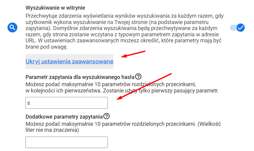 - Wyszukiwanie w witrynie – jeśli na Twojej stronie znajduje się wyszukiwarka, to pomiar jej wykorzystania w GA4 jest ułatwiony. Automatycznie wychwytywane będzie wyszukiwane hasło, o ile parametr wyszukiwania to “s”. Jeśli masz inny parametr wyszukiwania, wystarczy w ustawieniach zdarzenia wyszukiwania wpisać własny. To zdarzenie w GA4 nazywać się będzie view_search_results
