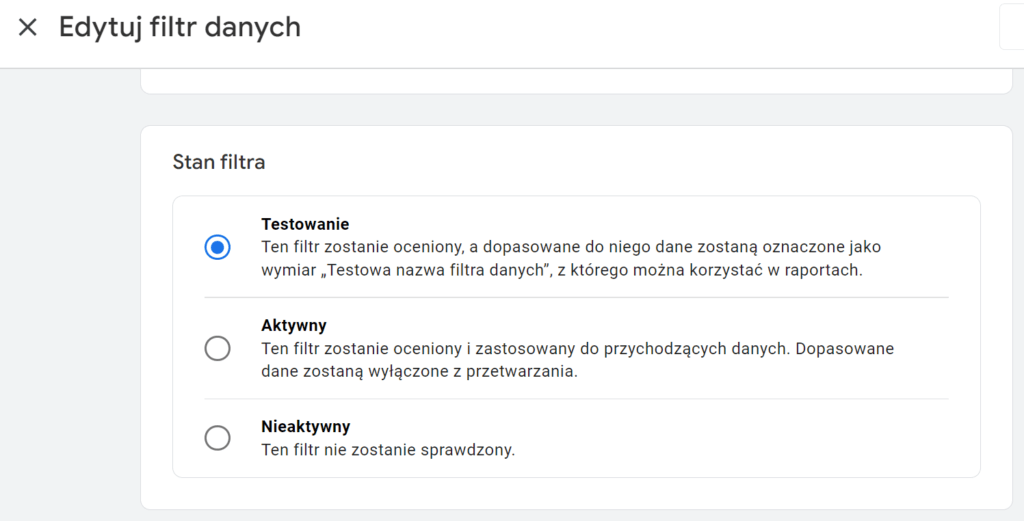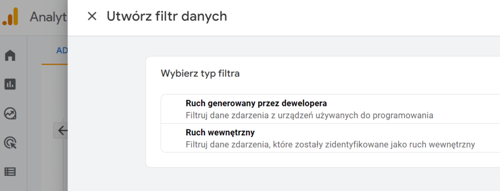 Ostatnia zakładka w Ustawieniach danych to Filtry danych. Jak na razie nie mamy możliwości ustawienia zbyt wielu filtrów. Na ten moment dostępne są dwa. Jeden pozwalający wykluczyć z raportów ruch wewnętrzny, drugi – ruch dewelopera strony lub aplikacji. Google Analytics 4 jest stale rozbudowywany, możemy założyć, że filtrów będziemy mogli ustawiać więcej.