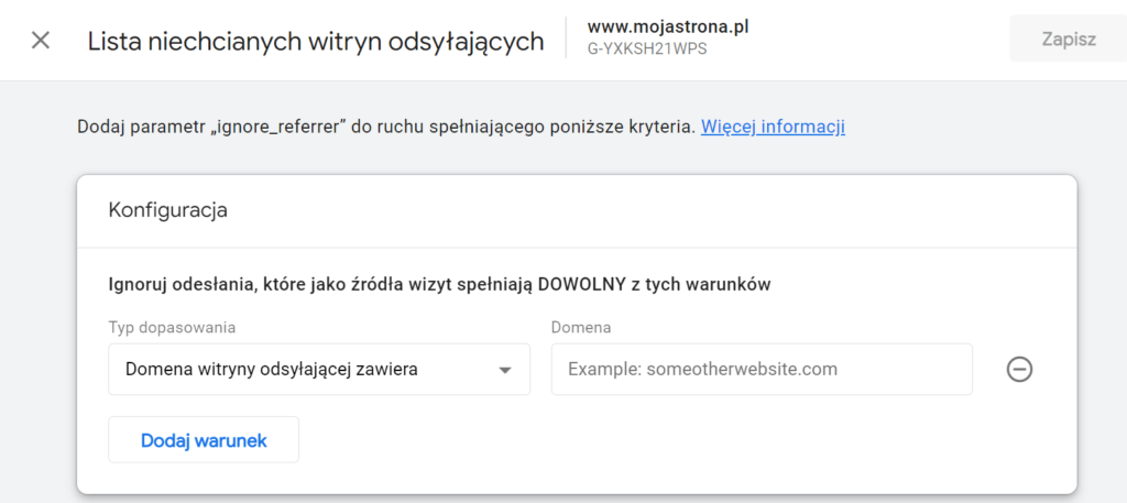 - wykluczenia witryn odsyłających – rozwiązanie znane z Universal Analytics. Najczęściej stosowane do wykluczenia stron banków i stron płatności. Strony banków nie powinny być traktowane jako źródło konwersji i transakcji, bo “tylko” w tym pośredniczą. Aby zabezpieczyć się przed tym, że dużą częścią źródeł ruchu będą takie strony, to należy dodać je do listy niechcianych witryn odsyłających.