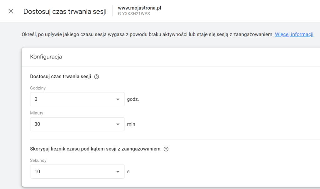 - zmiana domyślnego czasu trwania sesji i czasu, który oznacza sesję z zaangażowaniem. W GA4, podobnie jak w UA domyślny czas trwania sesji to 30 minut. Jeśli ten czas jest według Ciebie za krótki lub za długi, możesz go zmienić. Jeśli zamierzasz zrobić coś takiego, dobrze to przemyśl. Pamiętaj, że bardzo mocno wpłynie to na liczbę sesji, które widzisz w Analytics. Drugi parametr, czyli czas, po którym sesja zostanie uznana za sesję z zaangażowaniem, to domyślnie 10s. Również w tym miejscu możesz zmienić ten czas i dostosować go do swoich potrzeb.