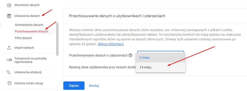 W sekcji Przechowywanie danych o zdarzeniach możesz zmienić domyślny czas przechowywania informacji o zdarzeniach. Mowa tutaj o zdarzeniach, które wykorzystasz we własnych raportach. Jeśli zostawisz 2 miesiące, pewne rzeczy będziesz mógł analizować tylko 2 miesiące wstecz. Dlatego od razu warto zmienić ten czas na 14 miesięcy.