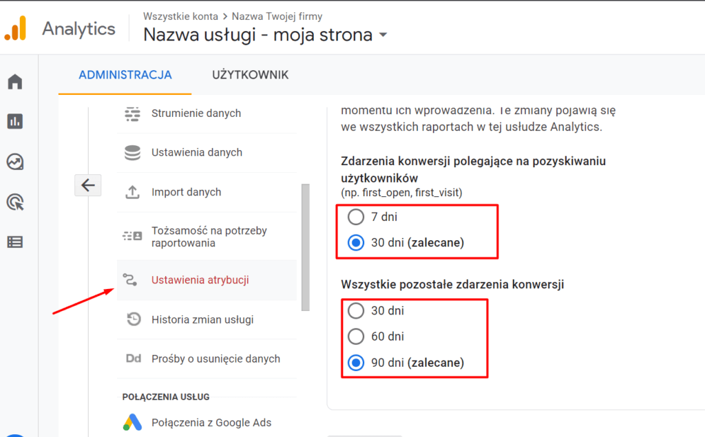 Trzecia wspomniana przeze mnie wcześniej sekcja to Ustawienia atrybucji. Coś czego nie mieliśmy w Universal Analytics. Możliwość zmiany domyślnego modelu atrybucji. Model atrybucji możesz ustawić na poziomie usługi w Ustawieniach atrybucji. Warto zauważyć, że domyślnym modelem w GA4 jest model oparty na danych (Data Driven Attribution). W Ustawieniach atrybucji masz też możliwość zmiany długości okien konwersji z domyślnych 30 dni (dla zdarzeń związanych z pozyskaniem użytkownika) i z domyślnych 90 dni dla pozostałych zdarzeń.
