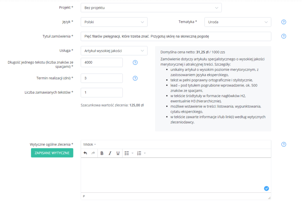 Zanim zaczniemy szaloną wycieczkę po nowoczesnej wyszukiwarce copywriterów, pierwszym naszym krokiem w procesie zlecania treści w Content Premium jest sporządzenie briefu. Wskazujemy tematykę (40 do wyboru) i jeden z 15 typów treści z gotowymi szablonami wytycznych. Po dopisaniu ewentualnych dodatkowych wskazówek określamy liczbę tekstów do zrealizowania, długość w zzs i czas na realizację. Co ciekawe, możemy wybrać opcję cyklicznej realizacji zlecenia (np. co tydzień kilka tekstów) – szczególnie przydatną, jeśli zlecamy przykładowo wiele podobnych opisów kategorii i chcemy, by sporządzała je ta sama osoba.