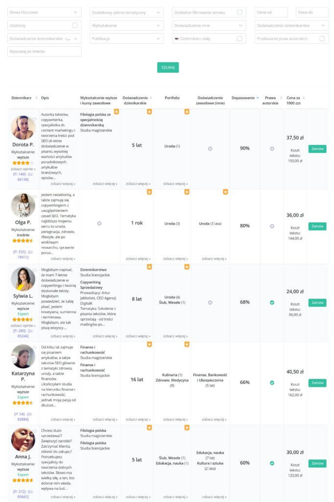 Informacje o doświadczeniu, wykształceniu, przykładowych treściach, ocenach poprzednich zleceń i opisy dziennikarzy dostępne są przy każdym profilu. Na liście dane ukazane są skrótowo, natomiast cały czas korzysta z nich algorytm, który przypisuje poszczególne informacje z profili do wytycznych zawartych w zleceniu. To sprytna bestia – za każdym razem moduł generuje dla zleceniodawcy inteligentnie dopasowaną listę dziennikarzy. Prawdziwy plac zabaw dla wymagających zleceniodawców.