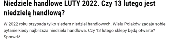 W większości z tych elementów nie może zabraknąć frazy kluczowej, na którą chcemy być widoczni, nie można jednak doprowadzić do takiej sytuacji, że słowo będzie wykorzystywane w każdym zdaniu i nagłówku, jak to jest w przypadku artykułów o niedzielach handlowych.