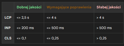 Po dokonaniu szczegółowej analizy strony należy krok po kroku ocenić wartość poszczególnych elementów Core Web Vitals. Jeśli znajdują się one w środkowym przedziale poniższej tabeli, oznacza to, że przy niewielkim nakładzie prac można doprowadzić czas ładowania strony do normy, jeśli jednak wszystkie wartości znajdują się w przedziale czerwonym, oznacza to, że czeka Was mnóstwo pracy.