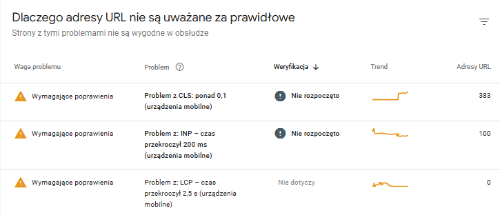 Kolejną możliwością jest weryfikacja w Google Search Console, jednak aby uzyskać dostęp do tych danych, witryna musi zostać wcześniej zweryfikowana. W momencie, kiedy posiadacie konto w GSC, wystarczy przejść do zakładki Podstawowe wskaźniki internetowe (w menu po lewej stronie po rozwinięciu listy Eksperymenty i personalizacja), gdzie znajdziecie pełen wykaz adresów niespełniających norm dot. CWV – zarówno w obrębie witryny mobile, jak i desktop.