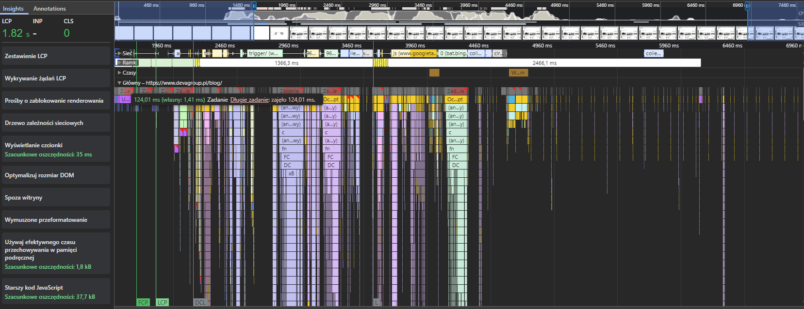 Pokazuje, kiedy na ekranie pojawia się jakikolwiek pierwszy element. Porównując FCP do LCP, możemy ocenić, jak szybko po pierwszym elemencie pojawia się ten najważniejszy. Wynik jest świetny (próg to ≤ 1,8 s). Oznacza to, że strona bardzo szybko pokazuje użytkownikowi pierwszy element.