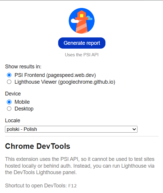 To oficjalna wtyczka, którą można zainstalować w przeglądarce. Wtyczka ta jest po prostu wygodnym skrótem do uruchomienia analizy za pomocą API PageSpeed Insights.