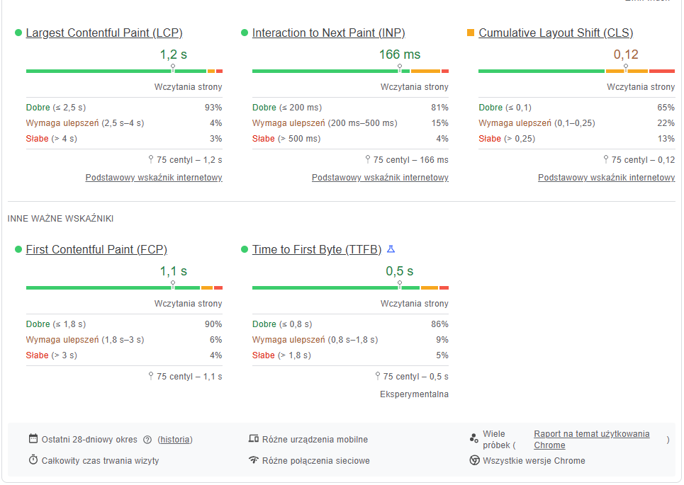 Wynik jest doskonały. Wartość 1,2 s dla 75. centyla mieści się z ogromnym zapasem w progu „Dobry” (≤ 2,5 s). Potwierdza to rozkład procentowy – aż 93% wszystkich wczytań strony miało „dobry” wynik LCP.