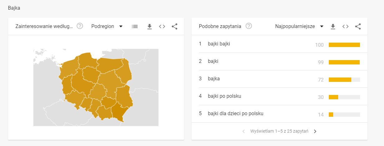 Temat Bajki pokrywa się częściowo z kategorią Dziecko, wyszukiwania w ostatnich miesiącach dotyczą tu fraz: bajki po polsku, bajki na dobranoc, bajki dla niemowląt, bajki cały film oraz poszczególnych animacji: Świnka Peppa, Strażak Sam, Sąsiedzi, Psi patrol, Traktory, Kajtus, Kotociaki, Myszka Miki.