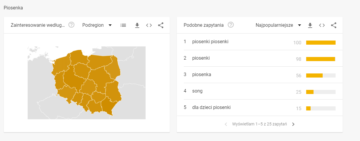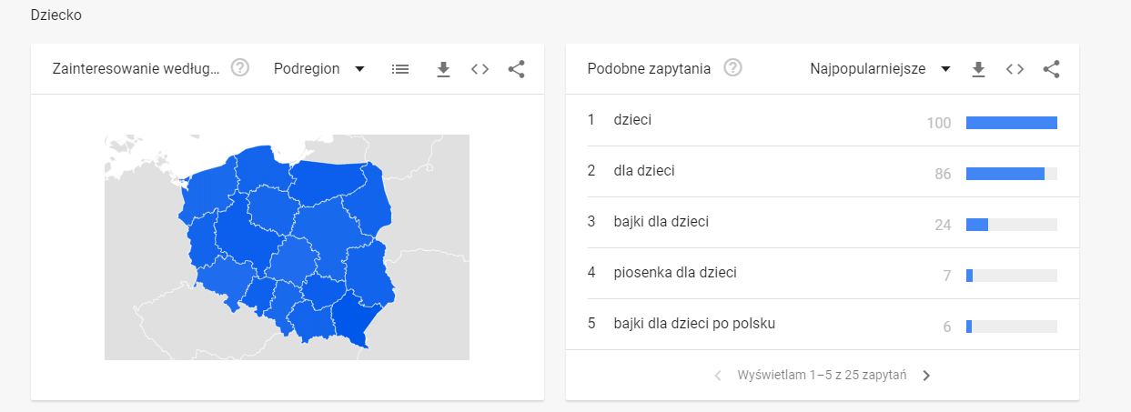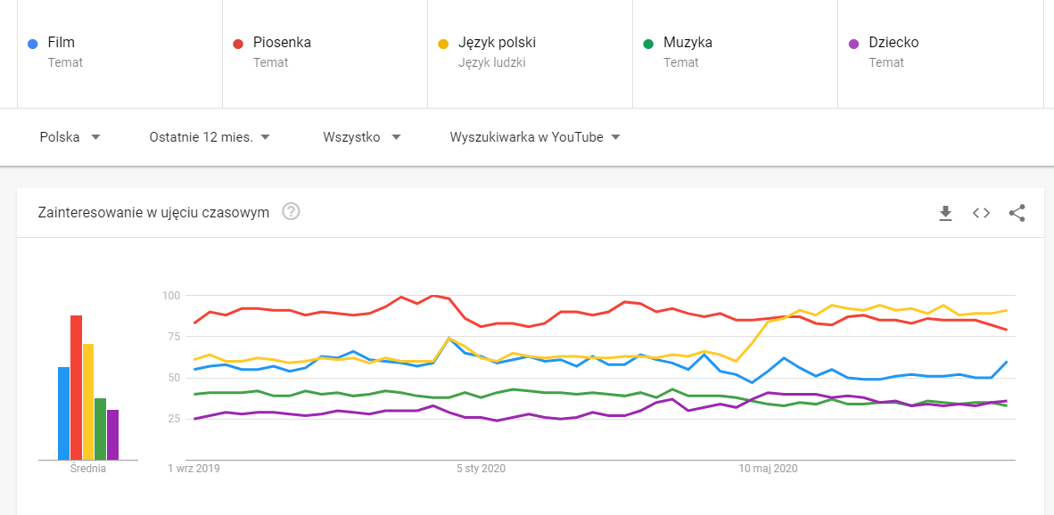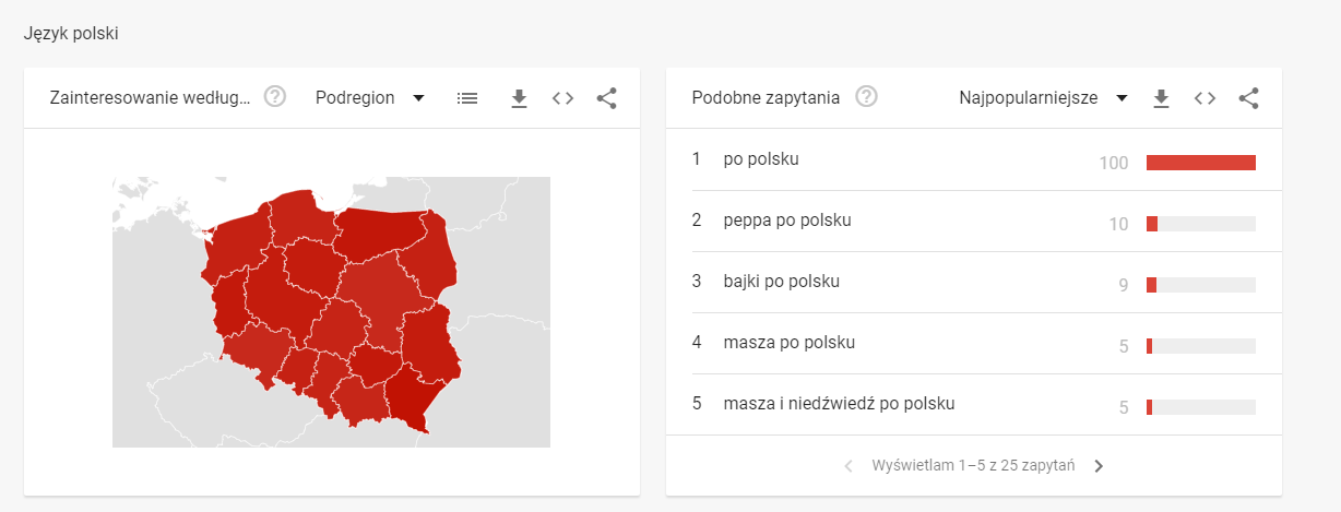Jako Język Polski użytkownicy wyszukują: konkretnych bajek dla dzieci (np. Masza i niedźwiedź, Świnka Peppa) lub ogólnie bajek, filmów po polsku i polskiego rapu.