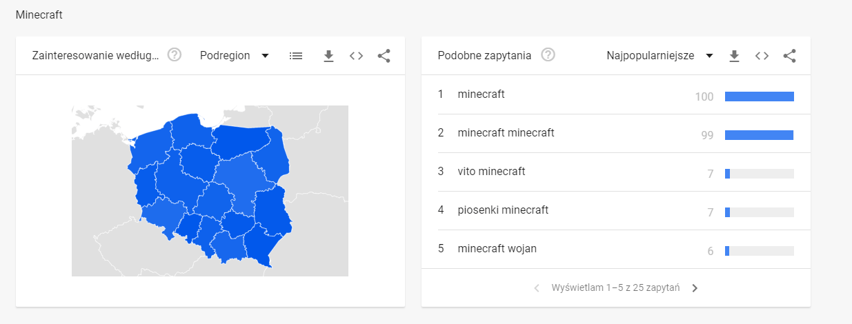 Minecraft ma całą osobną kategorię w Top 10 tematów jako jedyna z gier, co nie powinno nikogo dziwić 😉 Fortnite znajduje się w Top 25, jednak jest dużo niżej. Tutaj najpopularniejsze hasła to: minecraft piosenki, minecraft lego, minecraft survival, a także te związane z popularnymi kanałami, jak: wojan, vito i bella, gplay czy bobo.