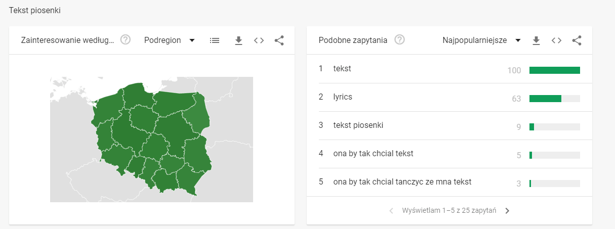 Najczęstsze w tematyce Tekstów piosenek są wyszukiwania ogólne dotyczące popularnych utworów, jak: Ona by tak chciała, Mama ostrzegała, Szampan, Superhero, Małolatki, Melodia itp.