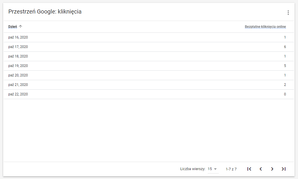 Oprócz danych w GA (po poprawnej konfiguracji UTM w linkach), mamy możliwość analizy danych w samym Google Merchant Center. Poniżej widoki, które przedstawiają kliknięcia w wyniki bezpłatne produktów.