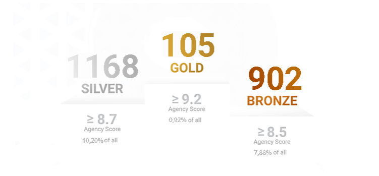 DevaGroup osiągnęła wynik 9.1, tak więc zabrakło naprawdę niewiele, aby uzyskać nagrodę Gold! Wśród polskich agencji, 2 otrzymały najwyższą nagrodę, 10 (w tym my!) nagrodę Silver i 10 nagrodę Bronze. Gratulujemy Website Style oraz ROXX za otrzymanie pierwszych miejsc, oraz Biuro Podróży Reklamy i Reach a Blogger – nasze wyniki są identyczne!