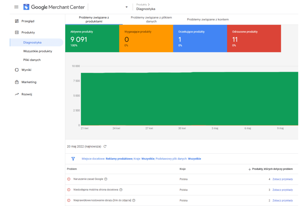 Jeśli remarketing dynamiczny wykorzystujemy tylko w kampaniach produktowych, problem będzie dotyczyć stanu produktów (czy zostały zatwierdzone i pozostają aktywne). Podobnie jak w pierwszym przypadku (weryfikacja zgodności z zasadami) – trzeba przeanalizować sekcję „Diagnostyka” w Google Merchant Center i wyłapać problemy, które uniemożliwiają zatwierdzenie produktów.