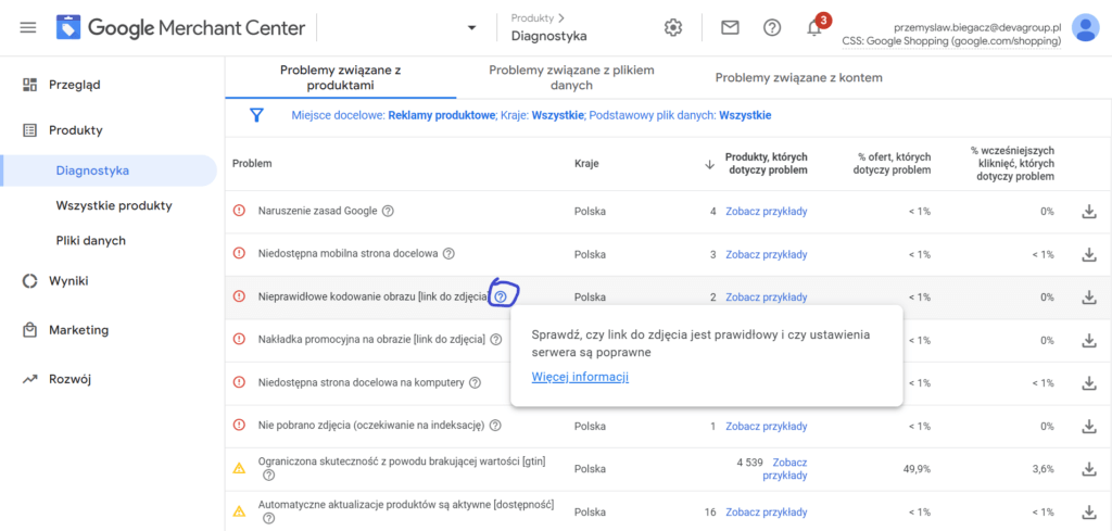 Jak to sprawdzić? Tego typu informacje możemy zweryfikować na poziomie narzędzia Google Merchant Center w sekcji „Diagnostyka”.