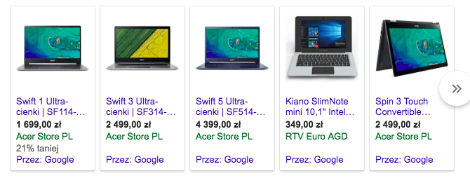 Na przykład po wpisaniu słowa Laptop do wyszukiwarki pokazuje się kilka artykułów sklepu Acer Store PL. Zawierają nazwę produktu oraz cenę.