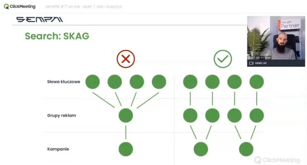 Polecam strukturę, gdzie oddzielnie używasz dopasowań ścisłych, a oddzielnie np. „do wyrażenia”. Wtedy z grup reklam zawierających słowa w dopasowaniu „phrase” wykluczasz słowa w dopasowaniu ścisłym i masz pewność, że wpadnie tam tylko jakaś wariacja Twojego SK. Wtedy mocno pracując na wykluczeniach możesz dosyć dobrze kontrolować zapytania i treści reklam.