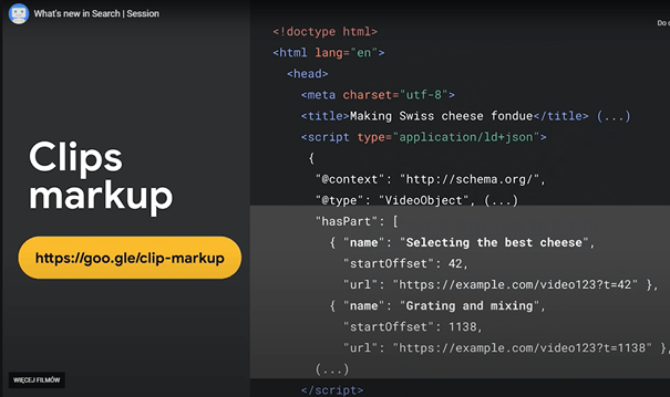John Mueller wspomniał także o nowościach w uporządkowanych danych wideo. Chcąc zwiększyć widoczność filmów w wyszukiwarce Google warto skorzystać z tzw. znaczników klipu, dzięki którym możliwe jest stworzenie kluczowych momentów wideo.