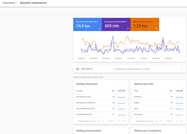 Ta pierwsza ma na celu pokazanie liczby próśb o zaindeksowanie witryny, podzielonych wg różnych stanów indeksowania, a także informacje o stanie hosta. Należy jednak pamiętać, że nie zastąpi to pełniej analizy logów serwera ponieważ Google Search Console to produkt Google i będzie skupiał się tylko i wyłącznie na ich bocie.