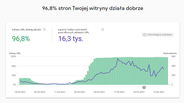 Druga nowość, czyli raport dotyczący wyglądu i działania strony. Jest on powiązany z aktualizacją Google Page Experience Update i ma na celu przekazanie informacji o ilości dobrej jakości adresów URL (czyli takich, które mają prawidłowe wartości wskaźników CWV) w obrębie witryny.