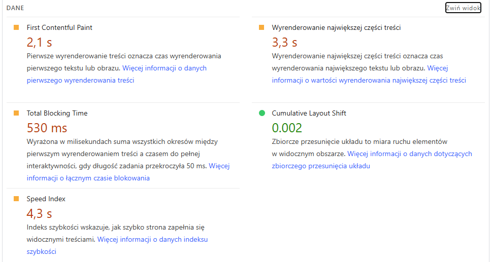 TBT (Total Blocking Time) – określa, jak długo strona była zablokowana przez procesy JavaScript i nie mogła reagować na działania użytkownika.