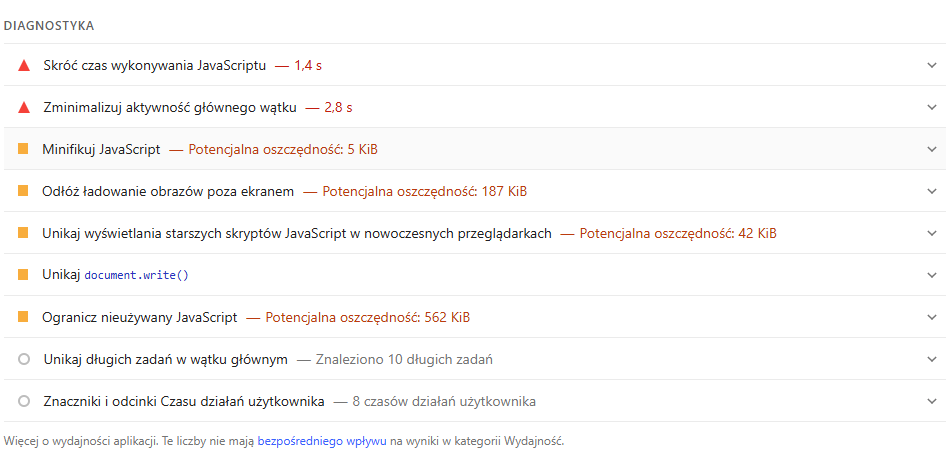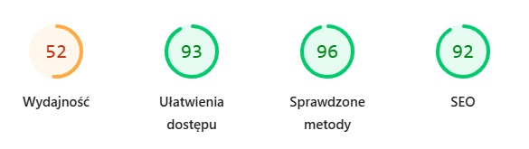 - 0-49 punktów (czerwony) – wydajność strony oceniana jest jako słaba,