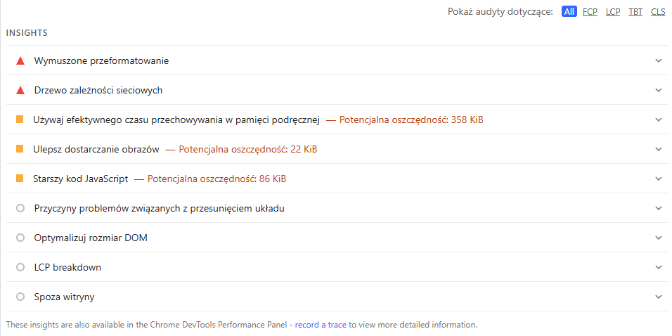 Sekcja ta zawiera również dane czysto informacyjne, takie jak „Optymalizuj rozmiar DOM” czy „Drzewo zależności sieciowych”, które pomagają w głębszej analizie, ale nie są bezpośrednią rekomendacją z oszacowanym zyskiem.