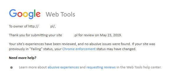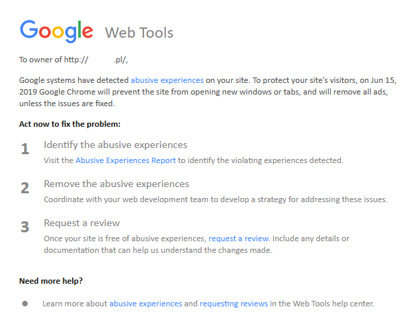 Nie ma żadnej przesłanki do tego aby za takie nadużycia Google karał spadkiem pozycji lub ograniczeniem widoczności serwisu. Kary, które opisano dotyczą blokady wyświetlania reklam na stronie, otwierania nowych okien i zakładek. Całość blokady dotyczy Google Chrome, co pokazuje jak dużą moc kontrolowania ruchu czy działania strony ma obecnie Google. Monitorowana strona, która dostała takie powiadomienie 16 maja do dziś nie odnotowała żadnych spadków. Dodatkowo powiadomienie jasno informuje o 30 dniowym terminie na poprawienie strony zanim kara będzie efektywna.