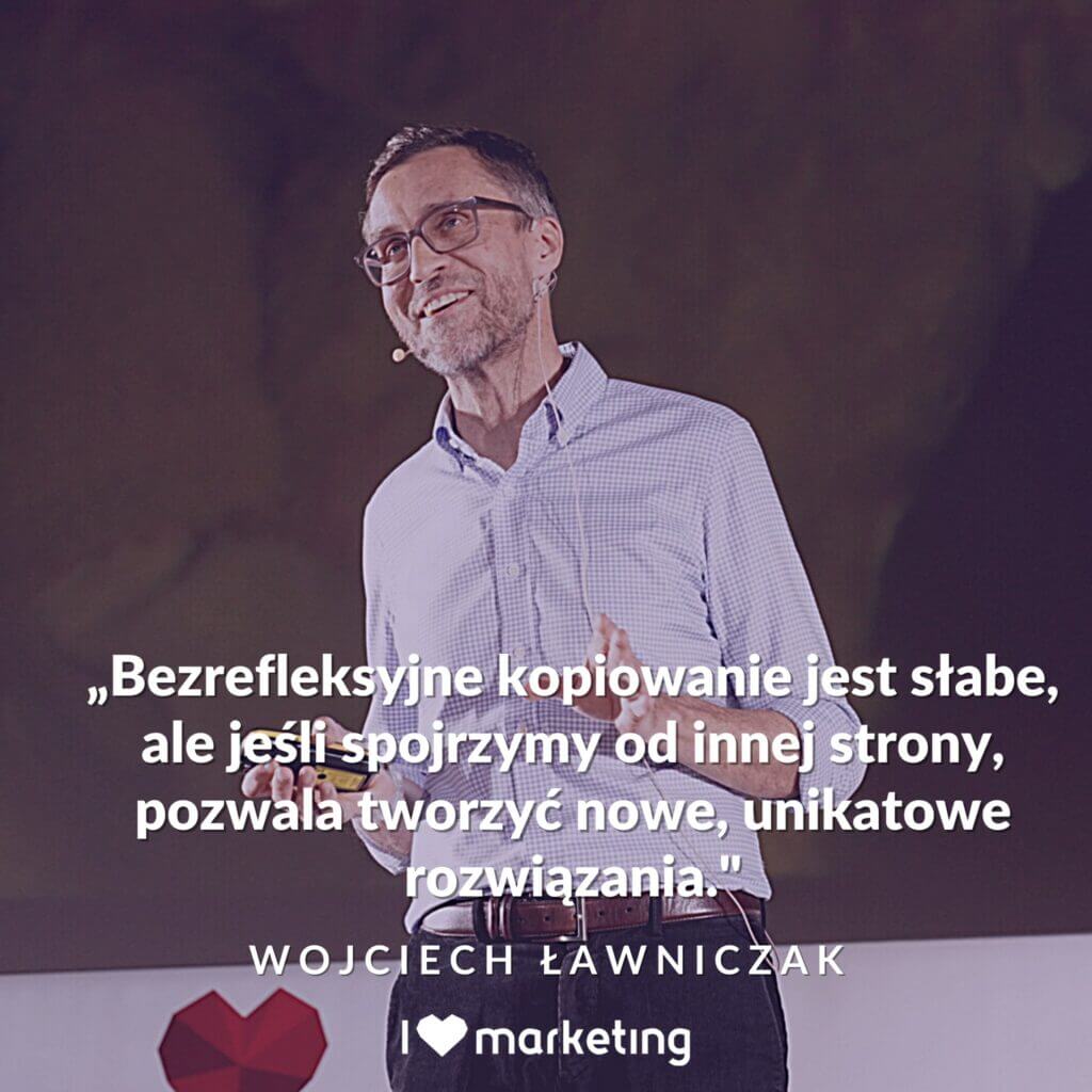 Prelegent zajął się tematem kopiowania. W naszym społeczeństwie jest ono odbierane bardzo negatywne i takie konotacje posiada. Natomiast jeśli zmienimy perspektywę na… chińską, to wszystko zmienia się zdecydowanie mocno! Chińczycy naśladują i podkradają europejskie budownictwo, ale dla nich jest to coś normalnego i dobrego. Udało się im skopiować m.in. Wieżę Eiffla, Łuk Triumfalny, Koloseum, a nawet całe miasto – Hallstadt! W ich kulturze kopiowanie jest zaszczytem dla obu stron: dla osoby kopiującej, że może tego zadania się podjąć, a dla osoby kopiowanej – że ktoś chce być taki jak on/ona. Wojtek przedstawił również Technikę Kwiatu Lotosu – yasuo matsumura – którą możemy przenieść do marketingu.