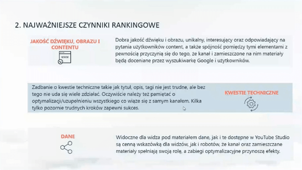 Ilość subskrypcji, widzów, wyświetleń, czas wyświetlania są brane pod uwagę przez algorytm YouTube’a. Im wyższe są te wskaźniki, tym większa szansa na to, że film pojawi się wyżej w wynikach wyszukiwania. Bardzo istotnym elementem jest też to, jak długo prowadzimy kanał, ponieważ większy staż, przekłada się na wyższy TrustRank. Filmy i kanał powinny być oczywiście optymalizowane, ale również interesujące dla odbiorców, odpowiadać na ich potrzeby, a także być publikowane regularnie. Tak więc tylko kompleksowe i systematyczne działania zapewnią dużą widoczność.